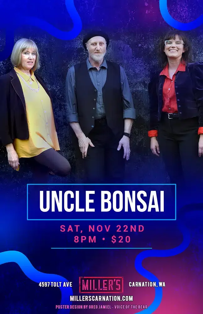 Carnation, WA - Miller's (Uncle Bonsai) Saturday, November 22, 2025 8:00 PM 10:30 PM Google Calendar ICS